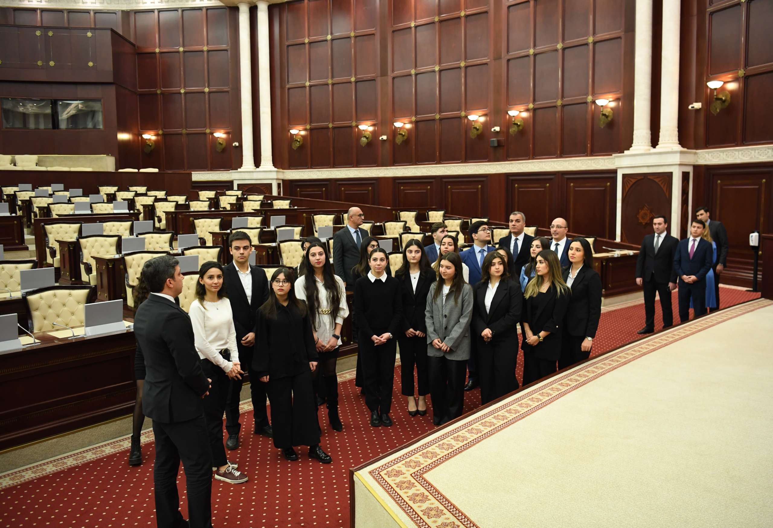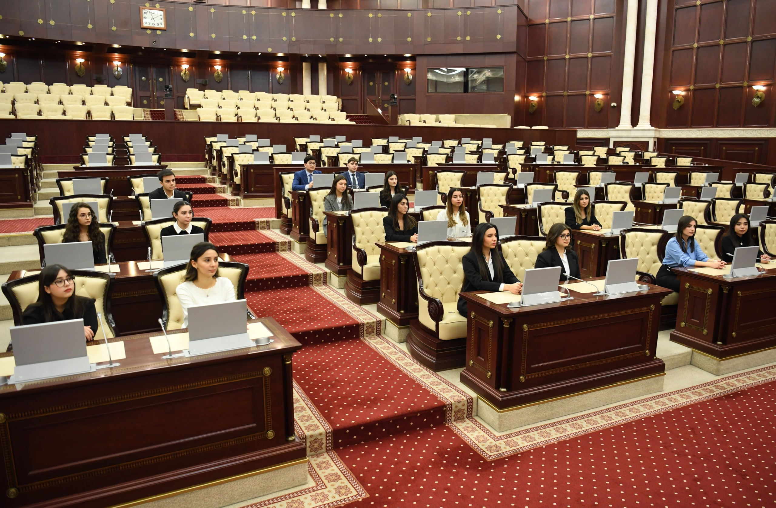 Parlamentin plenar iclas zalı ilə tanışlıq zamanı Milli Məclisin Müdafiə, təhlükəsizlik və korrupsiya ilə mübarizə komitəsinin sədri Ziyafət Əsgərov tələbələrə plenar iclas zalında yaradılmış iş şəraiti, Milli Məclisin fəaliyyəti, qanunvericilik prosesinin həyata keçirilməsi prosedurları haqqında məlumat verib.