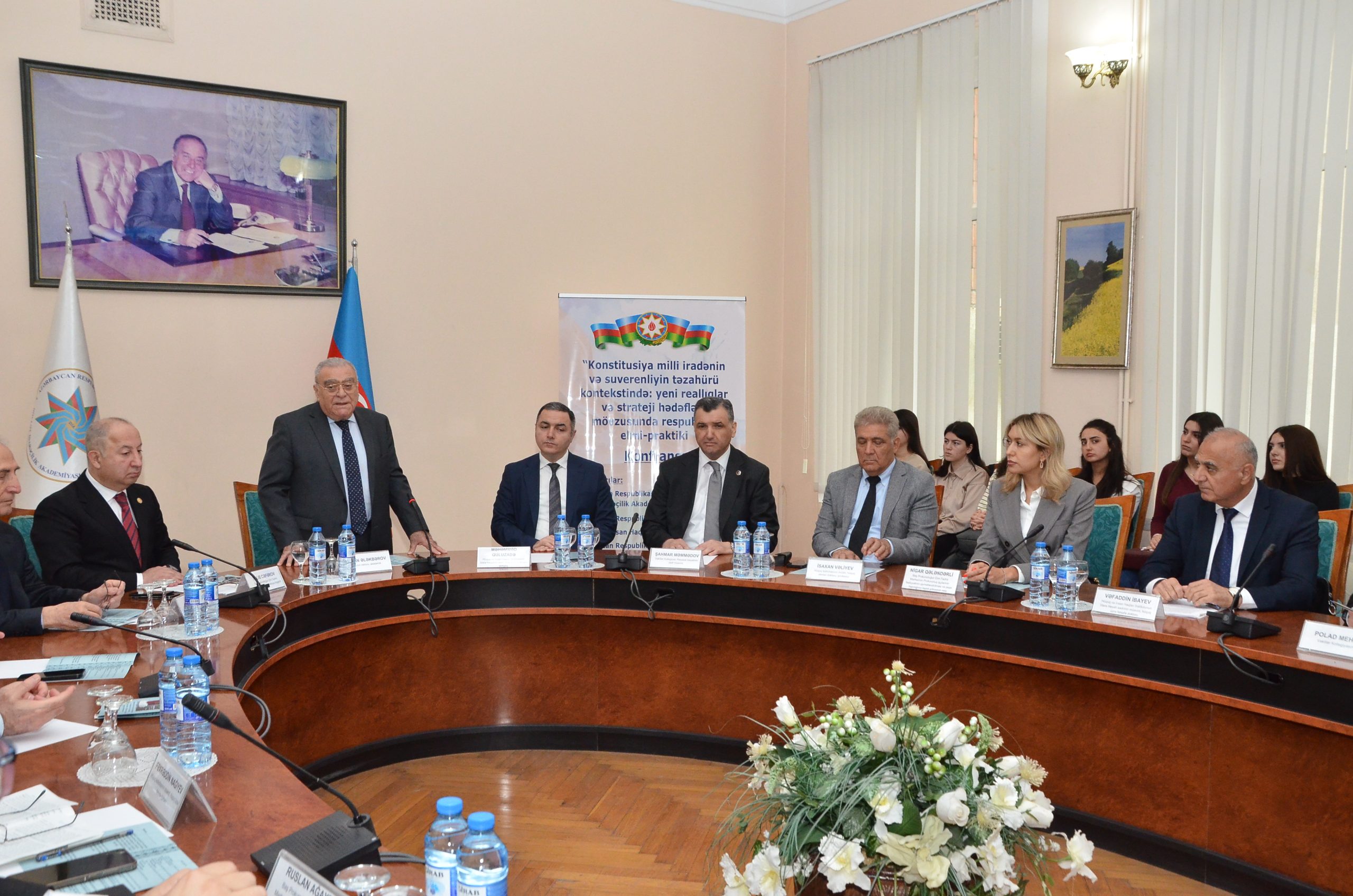 Tədbirdə çıxış edən Dövlət İdarəçilik Akademiyasının rektoru akademik Urxan Ələkbərov Azərbaycanda “Konstitusiya və Suverenlik İli”nə həsr olunan bu konfransın yeni çağırış və inkişaf yollarına yönəlik təkliflərin, fikirlərin müzakirəsi baxımından əhəmiyyətli olduğunu söyləyib. Azərbaycanın 2020-ci ildə ərazi bütövlüyünü, 2023-cü ildə suverenliyini tam bərpa etdiyini vurğulayan rektor deyib ki, bu, məqsədyönlü və uzunmüddətli fəaliyyətin planlaşdırılmasının nəticəsidir. Azərbaycanın iqtisadi inkişaf göstəricilərindən danışan akademik U.Ələkbərov bu baxımdan ölkəmizin sosial siyasəti imkanlarına diqqət çəkib. Rektor çıxışında hüquqi bazanın çox vacib olduğunu söyləyib.