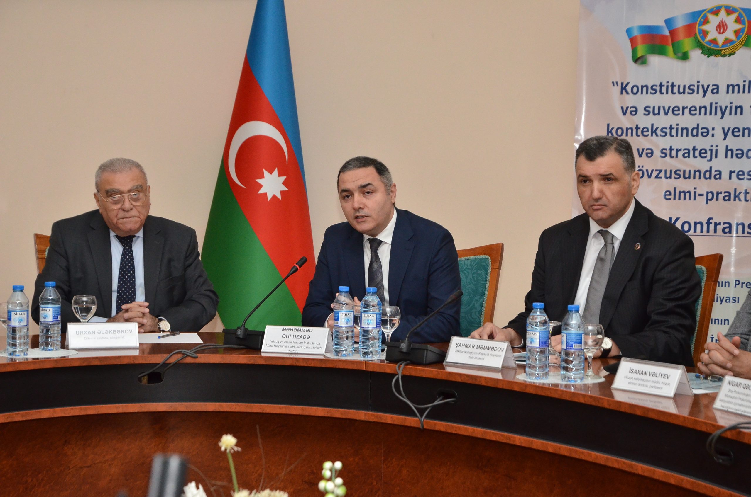 Elmi-praktik konfransda çıxış edən Baş Prokurorluğun Elm-Tədris Mərkəzinin rəisi Talıb Cəfərov bildirib ki, Azərbaycanın müstəqilliyinin və suverenliyinin bərpası tarixi zərurət idi: “Bu siyasətin banisi Ümummilli Lider Heydər Əliyev olub. Konstitusiyamızda olan prinsiplər hələ 200-300 il bizə xidmət edəcək” .